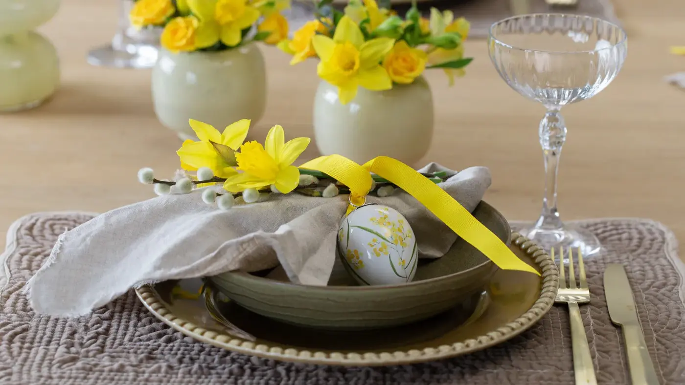 For å skape et koselig påskebord med gule blomster og påskepynt, kan du følge disse enkle tipsene fra Mester Grønn:
