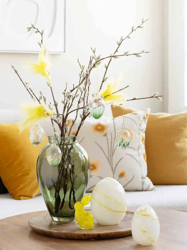 Påskepynt: Legg til litt påskepynt som gir bordet en ekstra touch. Du kan bruke små påskekyllinger, påskeegg, fjær, eller andre dekorative elementer. Husk å ikke overdrive – enkelhet er ofte det vakreste.