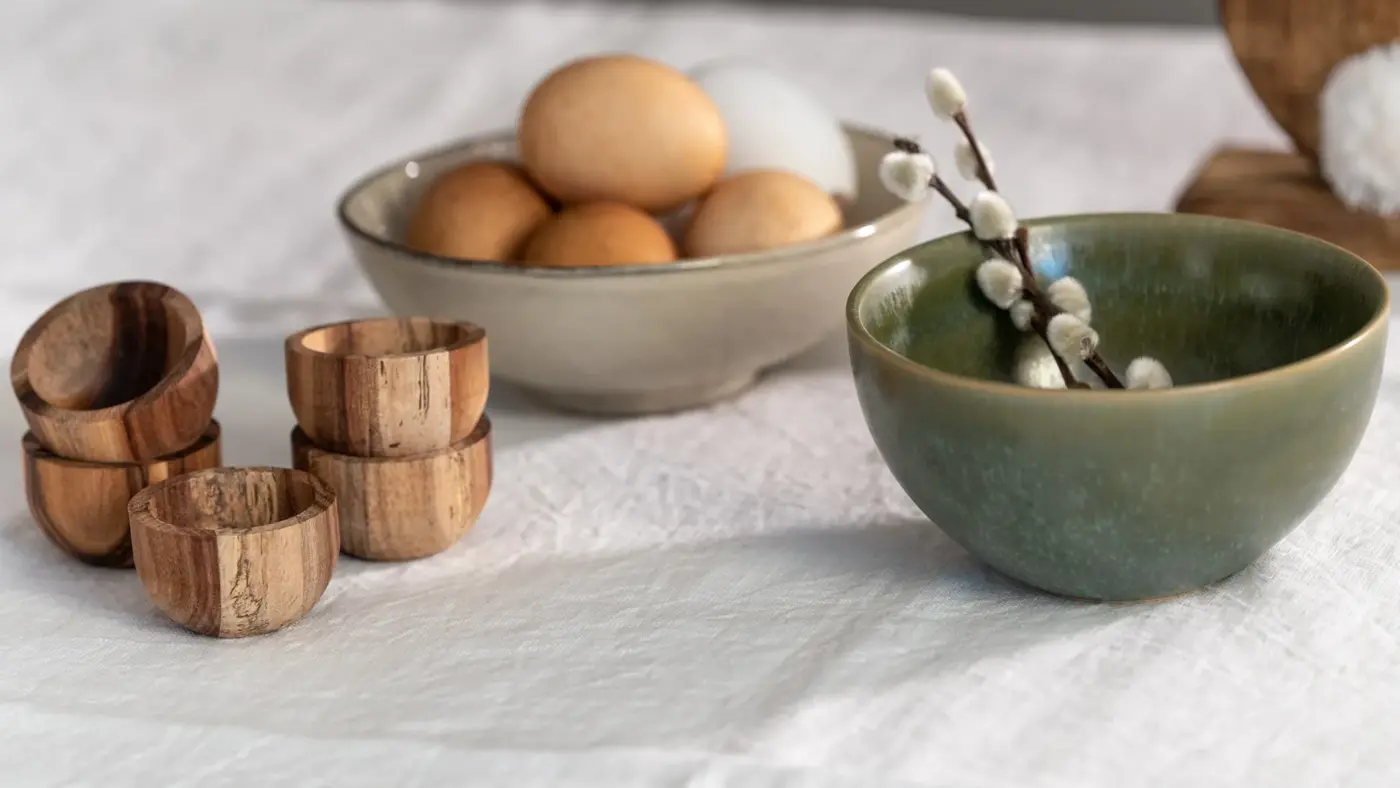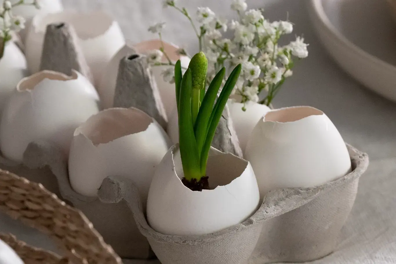 Er du glad i egg må du spare på eggeskallet – det blir den lekreste påskepynten. Små vaser til løkblomster eller andre små blomster du kan sette i vann. Bruk gjerne en eggekartong som du fyller med eggeskall til ulike blomster som dekor på frokost bordet. En fin aktivitet er å så karse oppi eggeskallet, da tar du litt bomull i bunnen heller oppi litt frø før du vanner. Vips kommer det spirer som er en frodig grønn dekor. Det smaker godt oppå gulostskiven også.