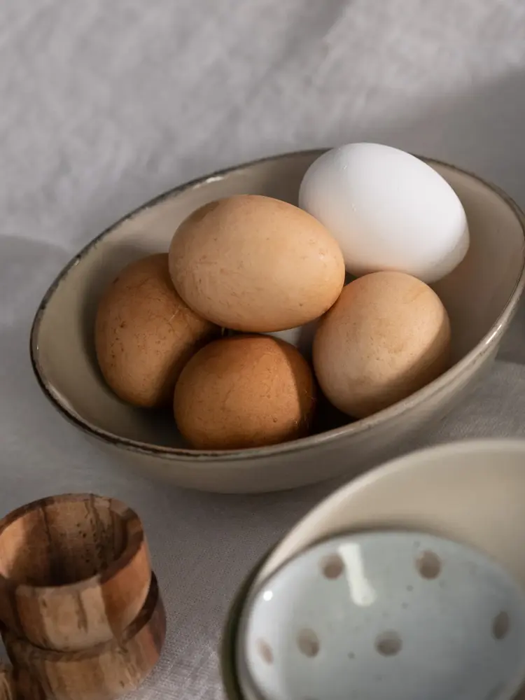 Jeg synes egg i ulike farger gir så fin effekt, det er vakkert å legge egg i ulike nyanser i en kurv. Jeg farget eggene ved å koke de i vann med løs te. Du kan også bruke andre fargesterke matvarer som gir kokevannet farge. De ulike fargene tonene fikk jeg ved å ta de opp fra vannet til forskjellig tid. Det tok litt tid å få de mørke, men det blir så fint. Vil du eksperimentere litt til kan du ta på en strikk rundt egget eller noen klistremerker. Da får du mønster når de er farget ved å ta av effekten etterpå.