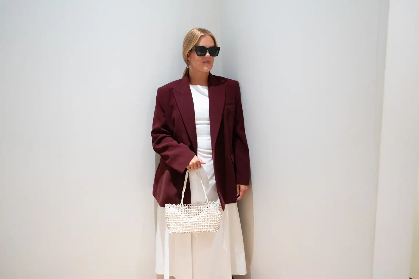 Blazere i burgunder eller brunt er spesielt populære for tiden, og hos Mango slang vi en flott burgunderfarget blazer over en sommerlig hvit kjole. Antrekket ble stylet med enkle mules i samme tone som blazeren, men her kan du velge ballerinasko, loafers eller pumps også.