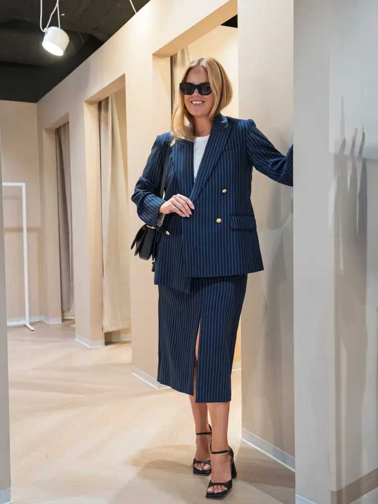 En tidløs klassiker av en grunn - den matchende dressen er og blir stilig. Her er den i skjørtevariant. Nålestriper er tradisjonelt, og svever i landskapet mellom preppy og strengt, derfor passer det ypperlig til litt strammere kleskoder. Her gjør det seg absolutt med høye hæler, men et par ballerinas med mer firkantet tupp er også et alternativ som gjør helheten med tøff og personlig.