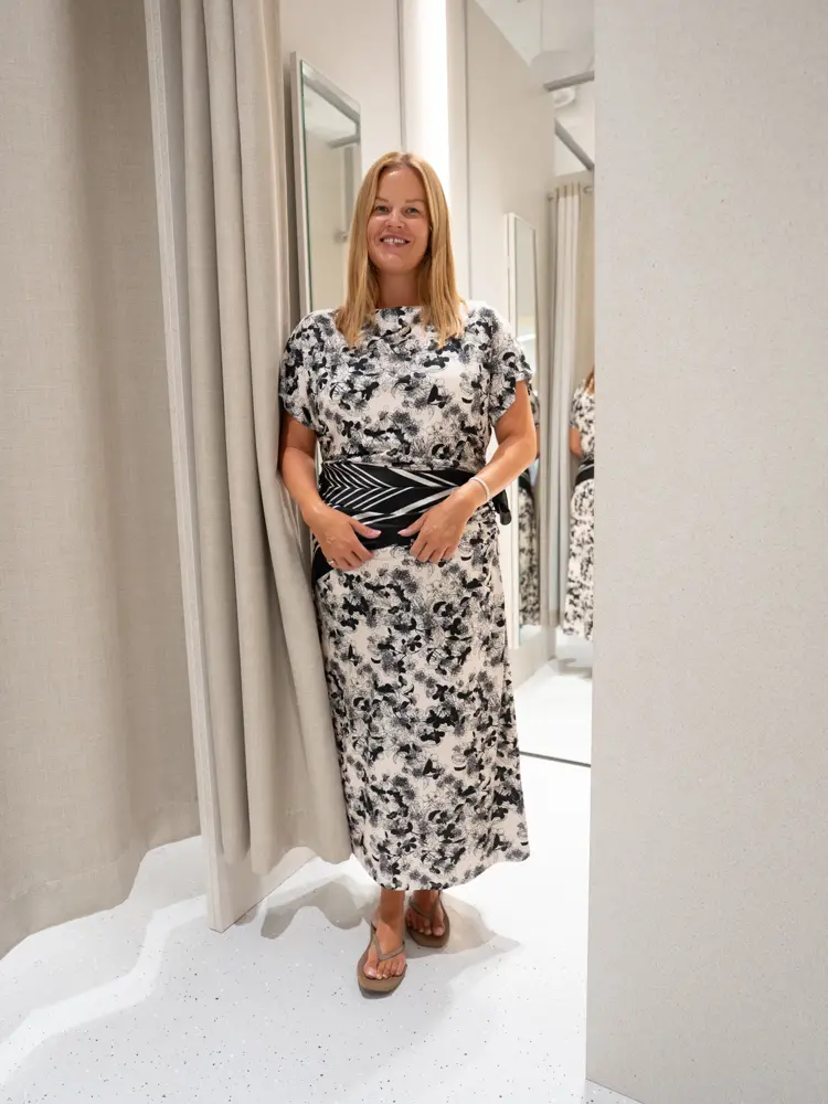 Lange kjoler har vi loffet rundt i hele sommeren, men denne varianten med enkle innsnevringer i siden er svært flatterende for enhver sesong, og det svart-hvite mønstret er dessuten enkelt å style opp og ned.