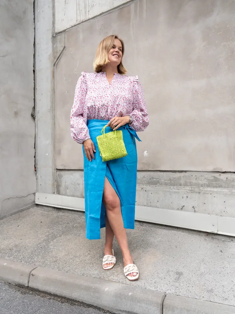 Småblomstrete bluser behøver ikke å bli altfor sukkersøtt, det kommer an på hva du bruker til. En syregrønn veske er kanskje et overraskende valg til, men det er gøy å overraske! Synes du det blir et hakk for mye, bytter du ut vesken med en hvit eller beige veske. Det bidrar til det feminine uttrykket i antrekket.