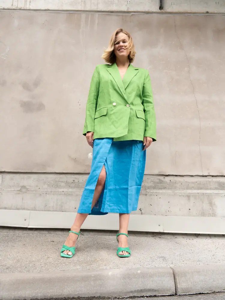 En blazer uten noe under er et stilsikkert valg på fest. Nok en gang mikser vi glade farger, og vi gjør det med glede! Grønt er skjønt, og en av sommerens store trendfarger.