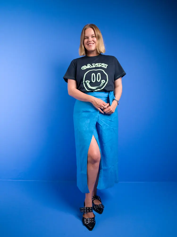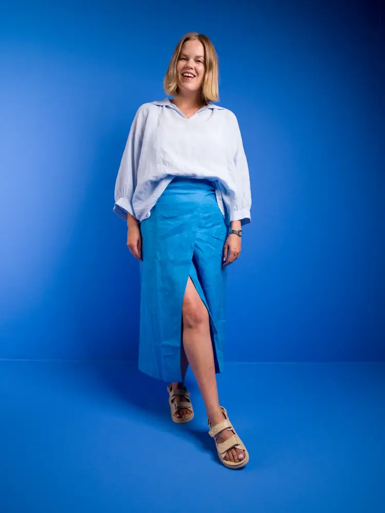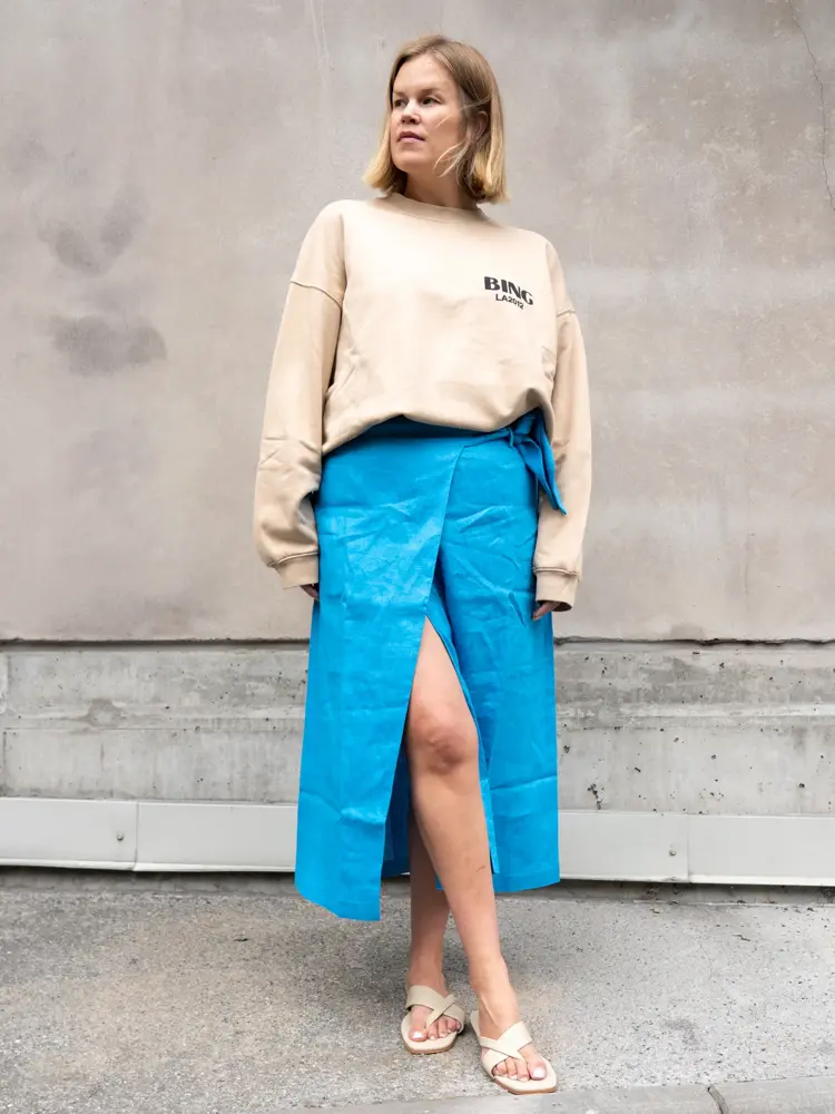 Skjørt er en favoritt sommerstid, og kommer i en mengde ulike design. Blant sommerens hotteste er både miniskjørtet og omslagsskjørtet i lin. Med utgangspunkt i et omslagsskjørt i en knallblå tone fra Mango har vi satt sammen ulike stylinger. Slik at du forhåpentligvis får inspirasjon til hvordan du kan bruke skjørtet på forskjellige måter. Skjørt er overraskende bruksvennlige, og kan styles opp og ned alt ettersom.