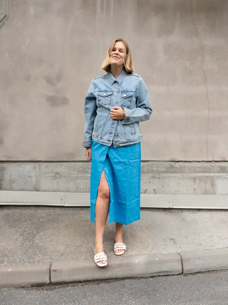 Denimjakken er en favoritt gjennom hele sommeren. Allsidig, praktisk og kul. Den kommer både i oversized og mer ettersittende varianter. I dette antrekket har vi valgt en mer ettersittende jakke fra littSNOB til det blå skjørtet. Du får en fin ton-i-ton-vri i helheten, og antrekket passer på litt kaldere sommerdager og på kveldstid. Under kan du ha en enkel spagettistropptopp.