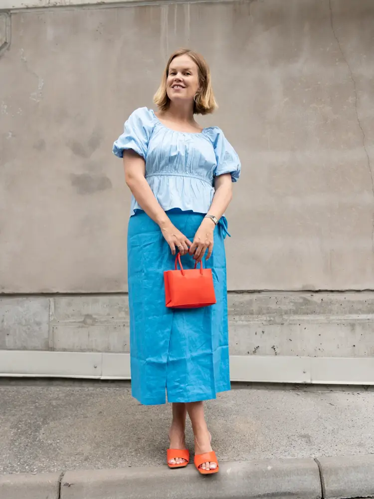 En søt topp med puffermer er helt perfekt til et fint skjørt. Fargerike antrekk er i vinden, og blått mot rødt er stilig som bare det. Slip-in sko er enkle i uttrykk og med en lav og solid hæl er de overraskende holdbare gjennom dagen og natten.
