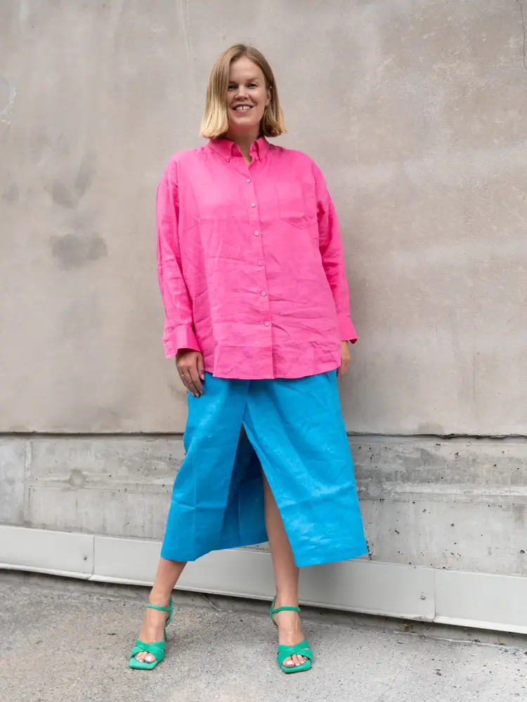 Er du glad i romslige silhuetter? Da er dette for deg! En oversized skjorte henger løst over skjørtet. Dette funker selvfølgelig like bra i helhvitt, svart eller andre farger, men det rosa mot det blå er en herlig fargekombinasjon, synes vi. Grønne hæler gjør deg festklar i en fei.