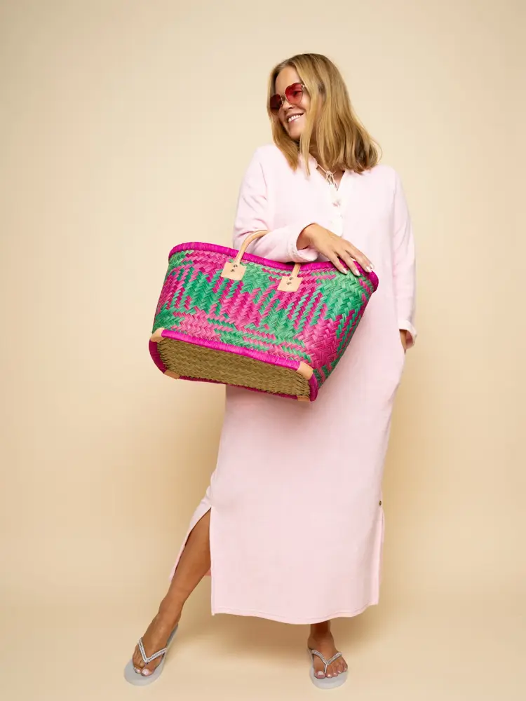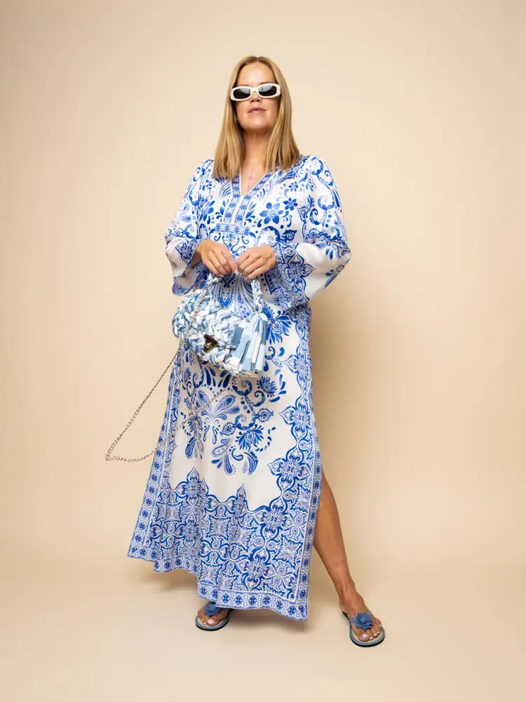 Alt av flettet tilbehør er en tydelig trend, og denne stofflettede vesken i ulike blåtoner er nydelig. Den er et blikkfang i seg selv og bidrar til å gjøre en stylingmiks av blått personlig og stilsikker. Kaftanen er en selvfølge på ferie, og funker like fint til frokost på hotellet, til stranda eller til drinker på kvelden.