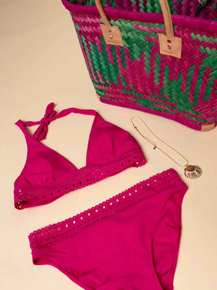 Bilde 1: Bikinitopp fra Marinka, kr 700, bikinitruse fra Marinka, kr 499 Bilde 2: Kjole fra Mango, kr 849 / Veske fra Mango, kr 349 / Sko fra Mango, kr 499 / Scrunchie fra Glitter, kr 99 / Øredobber fra Glitter, kr 249.