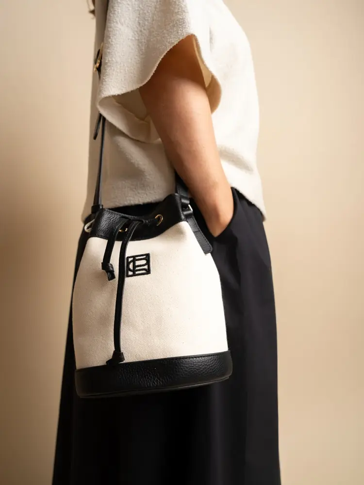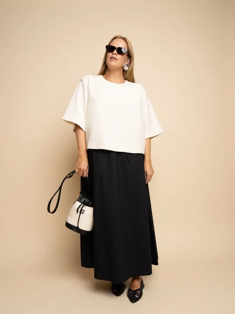 Antrekk fra the Vibe: topp kr 4100, skjørt kr 2000 / Ballerinas med hullmønster fra Scorett, kr 1300 / Øredobber fra Glitter, kr 199 / Bucket-veske fra The Vibe, kr 2200.