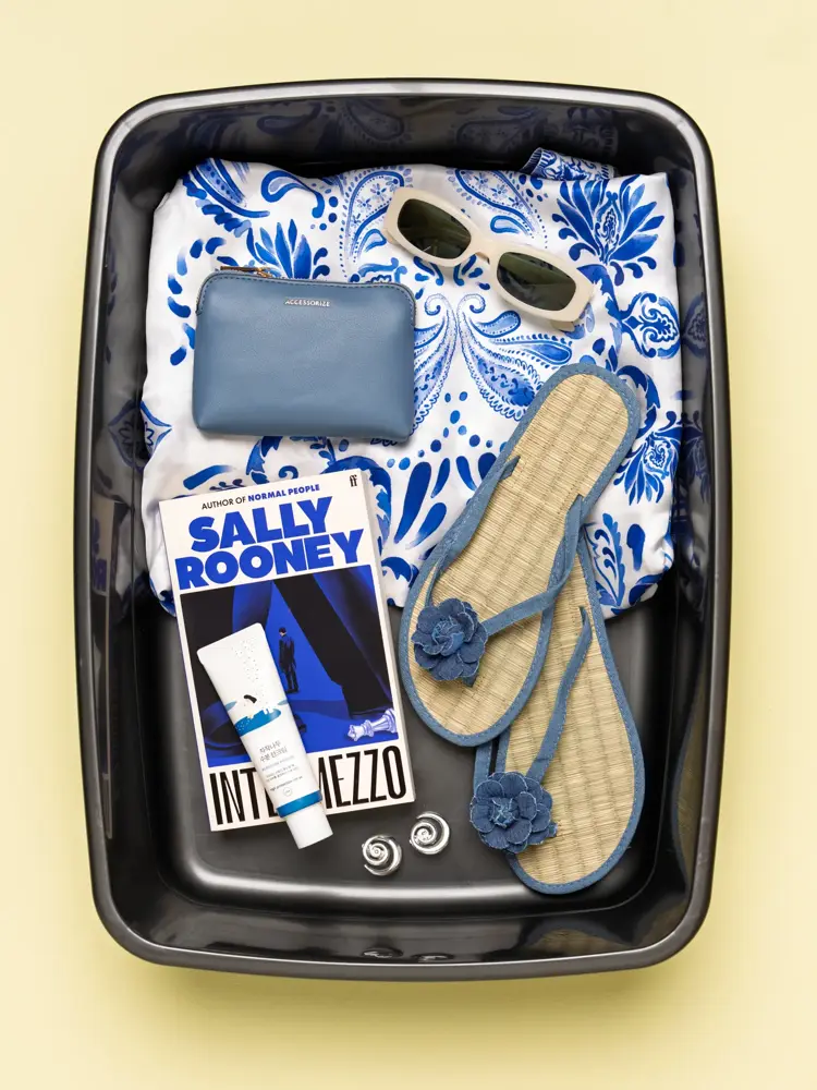 Hvite solbriller fra Mango, kr 299 / Blå lommebok fra Accessorize, kr 189 / Blå flip flops fra Accessorize, kr 219 / Skjelløredobber fra Glitter, kr 129 / Solkrem fra Pink, kr 299 / Bok fra Ark, kr 229 / Kjole fra 4 Women, kr 5600.
