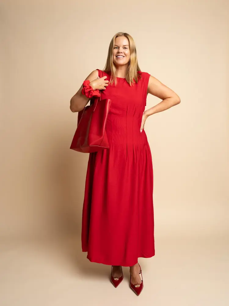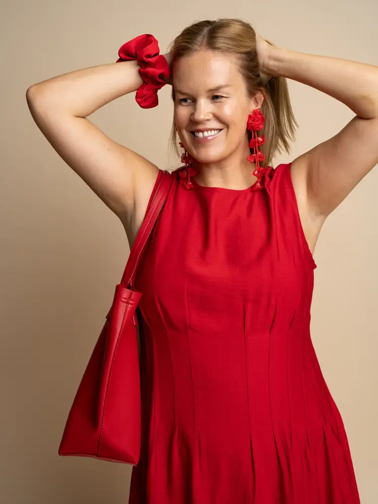 Om du syns rødt fra topp til tå blir for mye, kan du likevel pakke en feriegarderobe med rødt som en rød tråd. Øredobber, scrunchies, flip flopper, vesker og tørklær gjør susen. Et tørkle bruker du like gjerne som veskepynt som skaut, som et belte i midjen eller hengende rundt halsen.