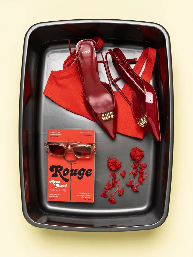 Røde øredobber fra Glitter, kr 249 / Bok fra Ark, kr 169 / Sko fra Mango, kr 499 / Bikinitopp fra Marinka, kr 700 / Solbriller fra Mark and Brandy, kr 1500.