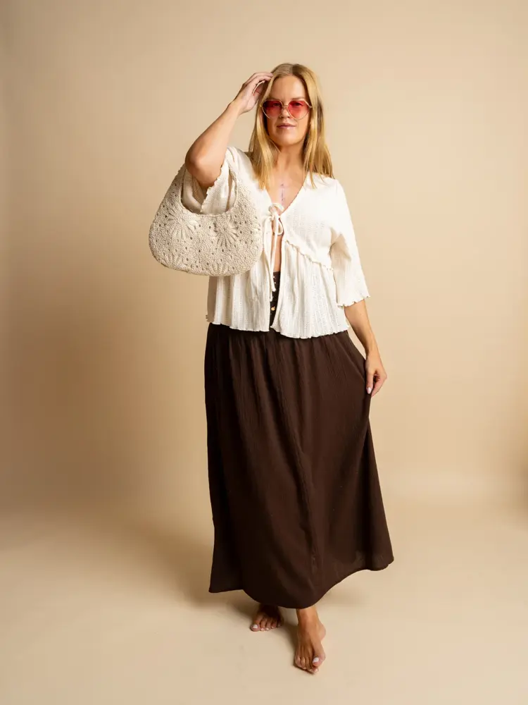 Topp fra Bik Bok, kr 359 / Brunt skjørt fra Bik Bok, kr 599 / Heklet veske fra Bik Bok, kr 399.