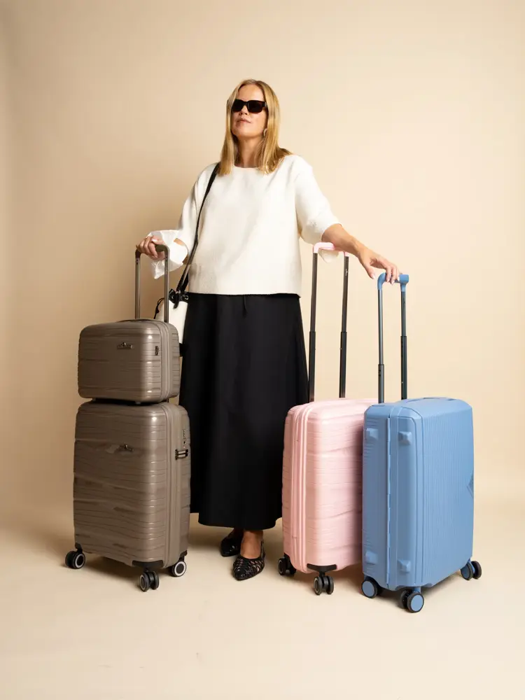 Kofferter fra Bagorama, kr 1349 for rosa og beige carryon, kr 1999 for blå, beige beauty box, kr 749.