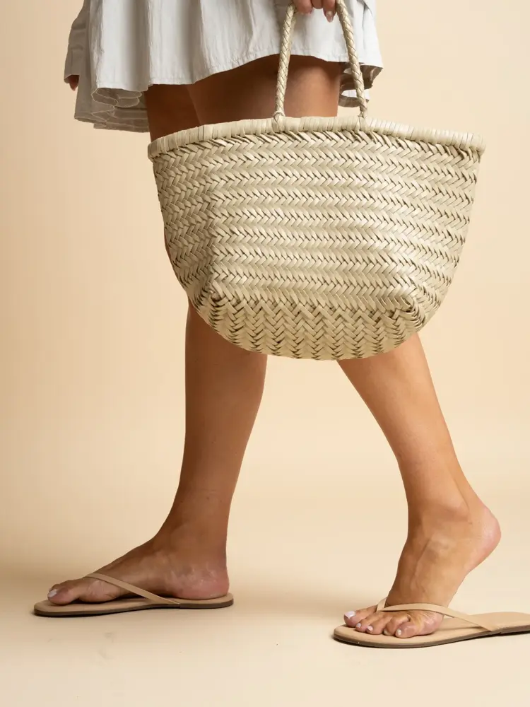 Drikkeflaske er et must på ferie (En variant i stål holder også drikker kaldt lenger), og den evig aktuelle stråvesken hører hjemme over skulderen ved bassenget eller på stranda. Komfortable flip flop-sandaler hører sommeren til, og i år sverger vi til varianter med utsmykning, som her med strass, eller med brosjer eller blomsterspenner på.