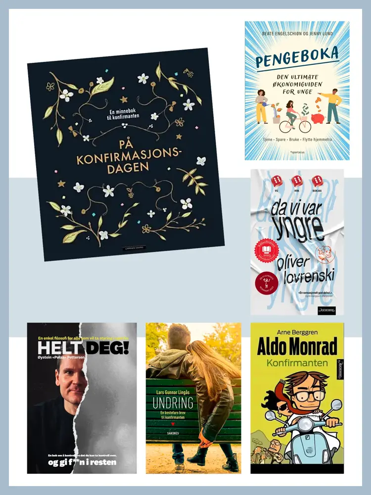 Gi en minnebok konfirmanten kan fylle med bilder og ord fra den store dagen. Pengeboka er full av gode tips om økonomi, og Helt Deg av Øystein Pettersen kan hjelpe ungdommen å ta styringen over eget liv. Stjerneskuddet Oliver Lovrenski skriver rått om ungdomstiden, mens Undring er et brev fra en bestefar til konfirmanten. Gi en bok du ønsker konfirmanten skal lese, som kan inspirere eller gi gode råd inn i voksenlivet.