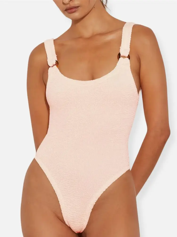 Brunt har de siste par sesongene opplevd en renessanse, og brunt badetøy er både glamorøst og stilrent. Vi synes denne fargen er et skikkelig godt alternativ til svart badetøy. I tillegg blir brunt veldig flott til gyllen hud. Style med en svart sarong, trekk en tøff bøttehatt over hodet og du er good to go!