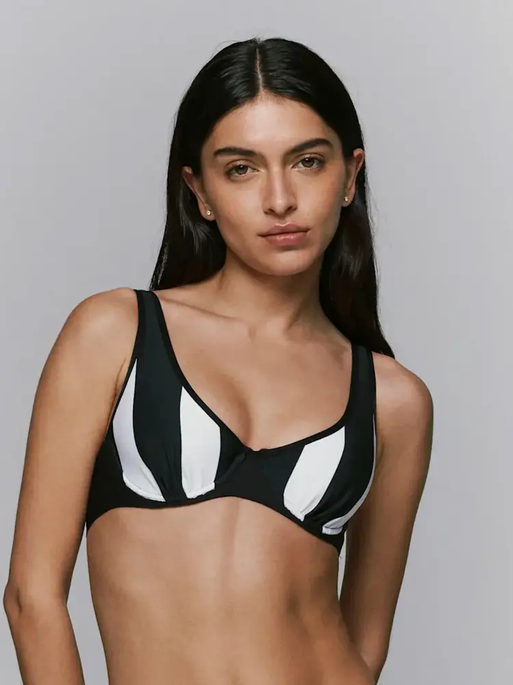 Bikini med solide striper og ensfargede partier fra Next To Nothing, kr 1400 for topp, kr 879 for underdel. // Svart og hvitstripete bikinitopp fra Marinka, kr 1029. Bikinunderdel finnes i ulike fasonger, fra kr 549.