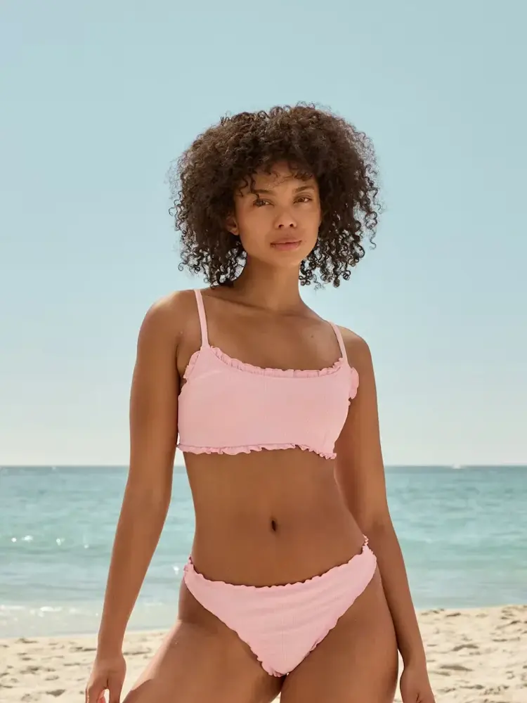 Rosa bikini i lurex fra Kappahl, kr 379 for topp, kr 249 for truse. // Rosa bikini med volangkant fra Cubus, kr 199 for overdel, kr 149 for truse.