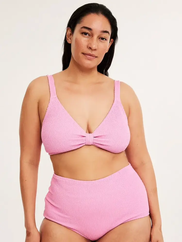Lurex er en vaskeekte badedraktklassiker, og sørger for litt feststemning i badedrakten eller bikinien. Et annet materiale vi liker for tiden er rynker. Disse rynkene var svært populær på 80-og 90-tallet. Også i 2025 er den poppis, og det er ikke uten grunn. Tekstur er alltid fint, og rynkene (crinkle på engelsk) gir også godt med stretch. I kombinasjon med farger, både sterke og pasteller, får du et akkurat passelig nostalgisk uttrykk. Lurexen er å finne overalt, bare se etter det litt glatte og metalliske materialet, eller det rynkete materialet. Bruk den til bomullsshorts på hytta, til frottétunika eller til en oversized skjorte.