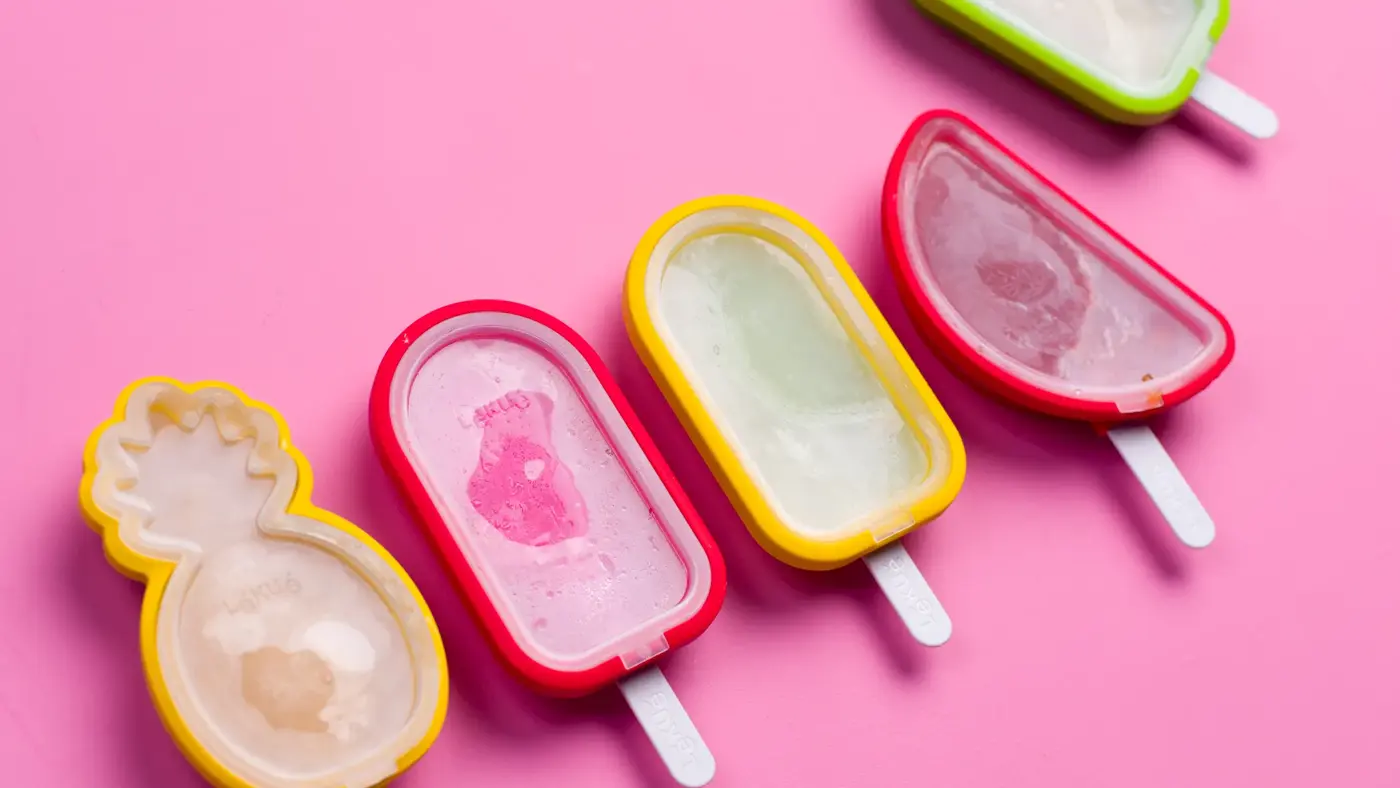 Du kan gjerne putte fersk frukt, som en skive kiwi eller jordbær, oppi formene. Det er estetisk fint, og ekstra spennende for små isglade barn.