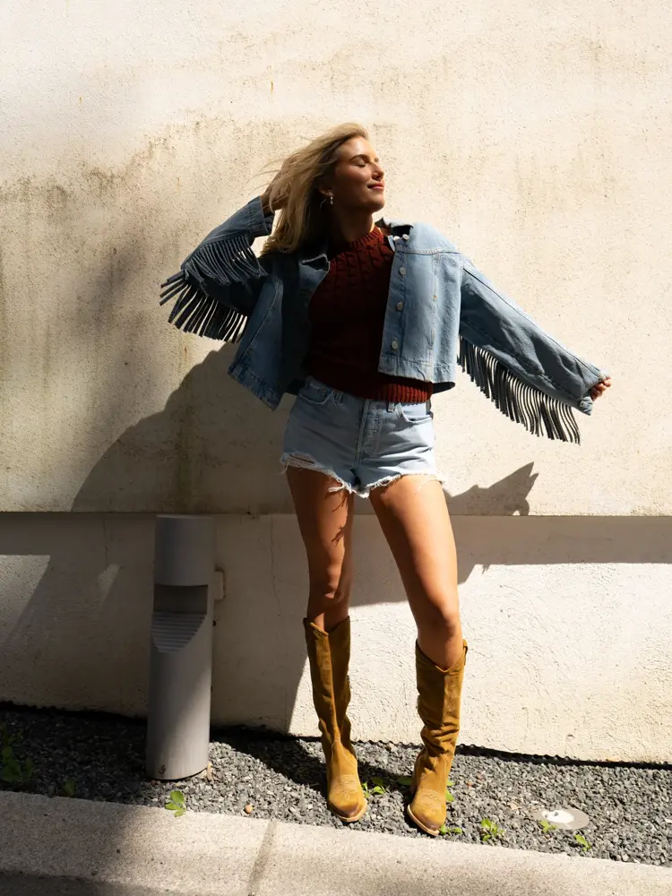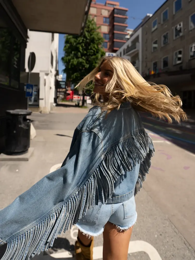 Denimjakke med frynser, kr 2000 / Topp kr 499 / Levis shorts kr 669 / Alt fra Message.
