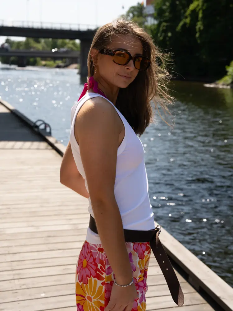 Vi har nevnt hatten, og slår et slag for en kul og stilig hatt på festival. Den skygger passe for solen, og her er det mulig å gå for enkelt i capsform, trendy i bøttehatt, egenartet i farger eller sommerlig i stråhatt. Eller er det i sommer du velger cowboy-hatten? Velg smykker som bidrar til å understreke stilen du går for, chunky ringer til dempede farger, lag på lag smykker til en 70-tallsinspirert stil eller fargerike øredobber til en enkel stil med jeans og singlet. Ankellenker hører med til sommeren og er perfekt til sandaler og sneakers. Solbriller er et must på solrike dager og nå er det stilig med farget glass på brillene. Belter kan brukes som pynt og ha gjerne et hengende på hoftene.