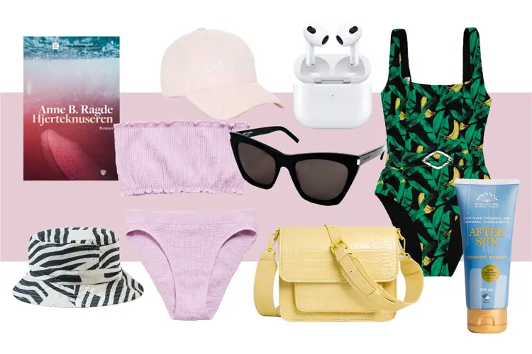 En caps, bøttehatt, solskjerm eller hatt beskytter hodet, ansikt og hår mot solens skarpe stråler. Når du først har plassert kroppen på stranden eller i en solstol ved bassenget, er nær tilgang til solkrem, bok, telefon og airpods et must. En søt veske til kveldstid i en herlig farge er superfin til solkysset hud, og huden pleier du med en behagelig after sun. Det både fortjener og trenger den etter en dag med solstråler og bading.