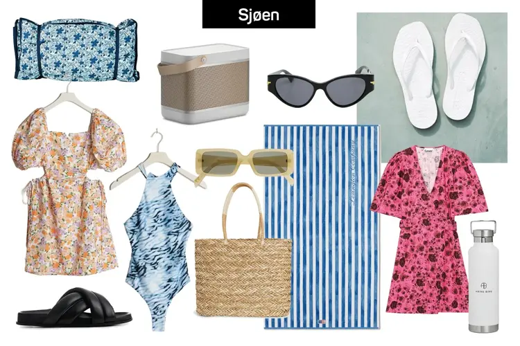 Strandmadrass med KID 249,95 Kjole Gina Tricot 499,- Sandaler Anine Bing Kiman 3100,- Beolit 20 Powerful bluetooth speaker Bang & Olufsen 5500,- Badedrakt Gina Tricot 599,- Solbriller fra Mango 199,- Stråveske Kappahl 399,- Solbriller Bottega Veneta Krogh Optikk 3390,- Badehåndkle Lexington 795,- Sleepers flip-flop Mark + Brandy 400,- Kjole Ganni 1795,- Vannflaske Anine Bing Sport Kiman 650,-