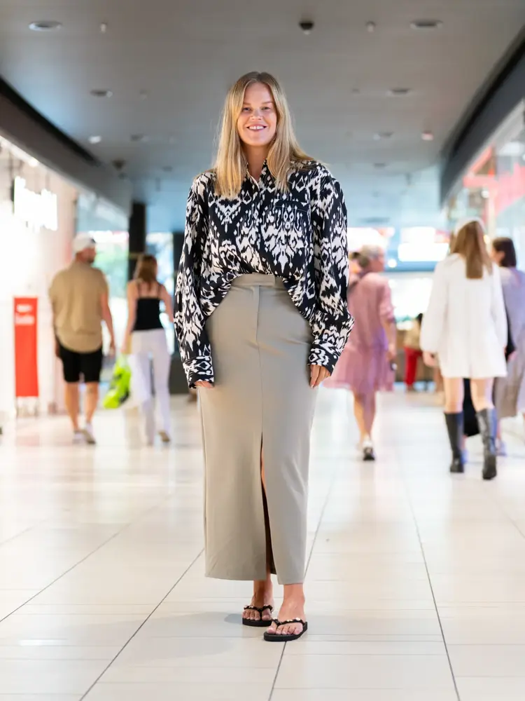En stilsikker trend i sommer er det fotside skjørtet. Her med en vakker mønstrete skjorte, og resultatet er en tidløs og elegant stil. Style med en løs stroppetopp på de varmeste sommerdagene, til en tubetopp for å rette blikket mot skulderpartiet eller til en enkel t-skjorte. Det er rått å velge enkle flip flops til, som bidrar til å gjøre antrekket mer avslappet.