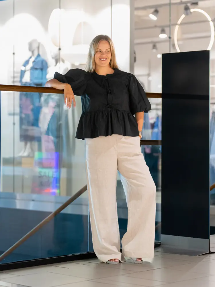 Knytetoppen er virkelig i vinden, og kommer i en rekke varianter i år. Knytetoppen er den perfekte miks mellom søt og kul, og den kan styles til så å si alt. Åpen til en spagettistroppkjole, til løse denimshorts eller oversizede jeans eller som her - til en løs og ledig dressbukse i lin. Også nydelig til silkeskjørt og høye hæler på fest!