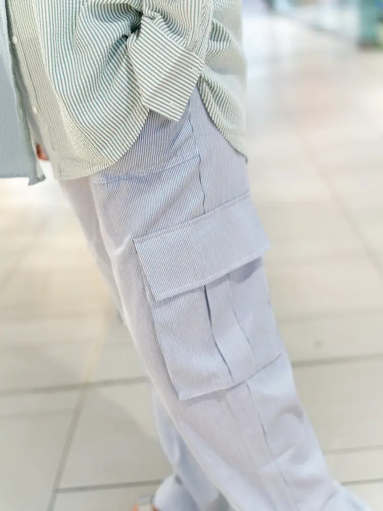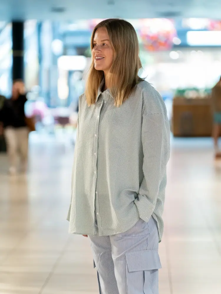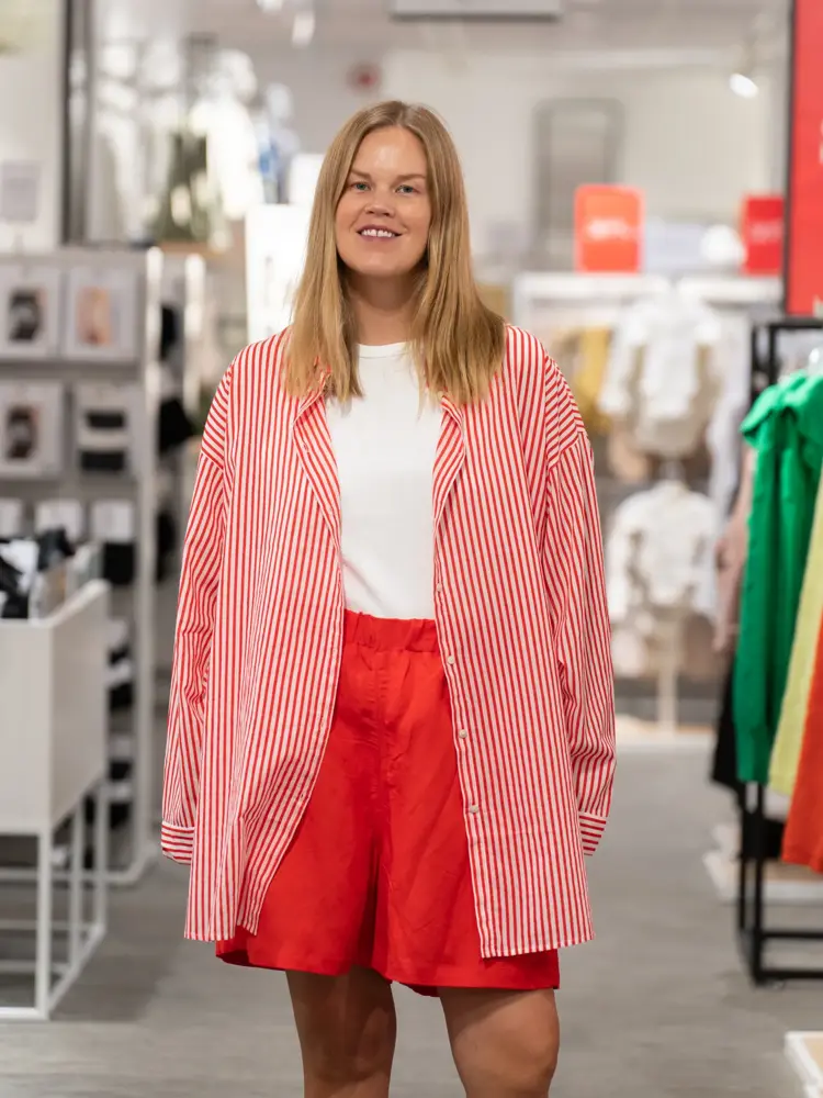 Den stripete skjorten og/eller den stripete buksen er populære. Her har jeg stylet den på to forskjellige måter. Til røde shorts for en stil som oser av kul stil på stranden, og striper med striper for dager og kvelder på hytta. Den stripete buksa er også råfin til en hvit skjorte eller singlet.