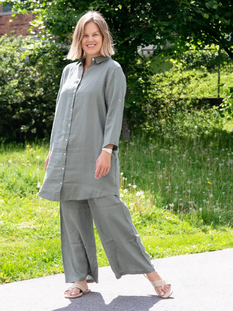 Lys beige og kaki er farger som passer perfekt på for eksempel lin. Sett prikken over i’en med smykker i sølv og enkle sandaler.