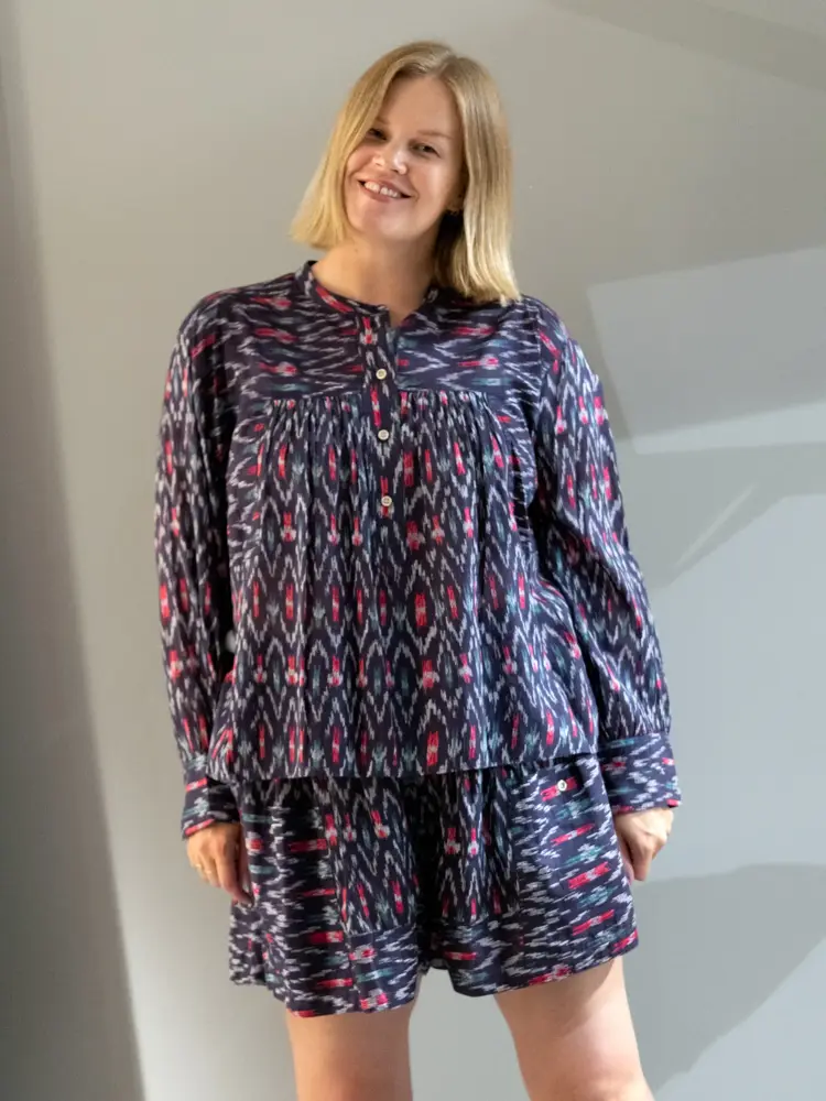 Rosa sett fra Apof 2900,- for overdel 2200,- for shorts | Mørkeblått mønstrete sett fra Isabel Marant Etoile 2900,- for overdel 2600,- for shorts. Alt fra Mark + Brandy