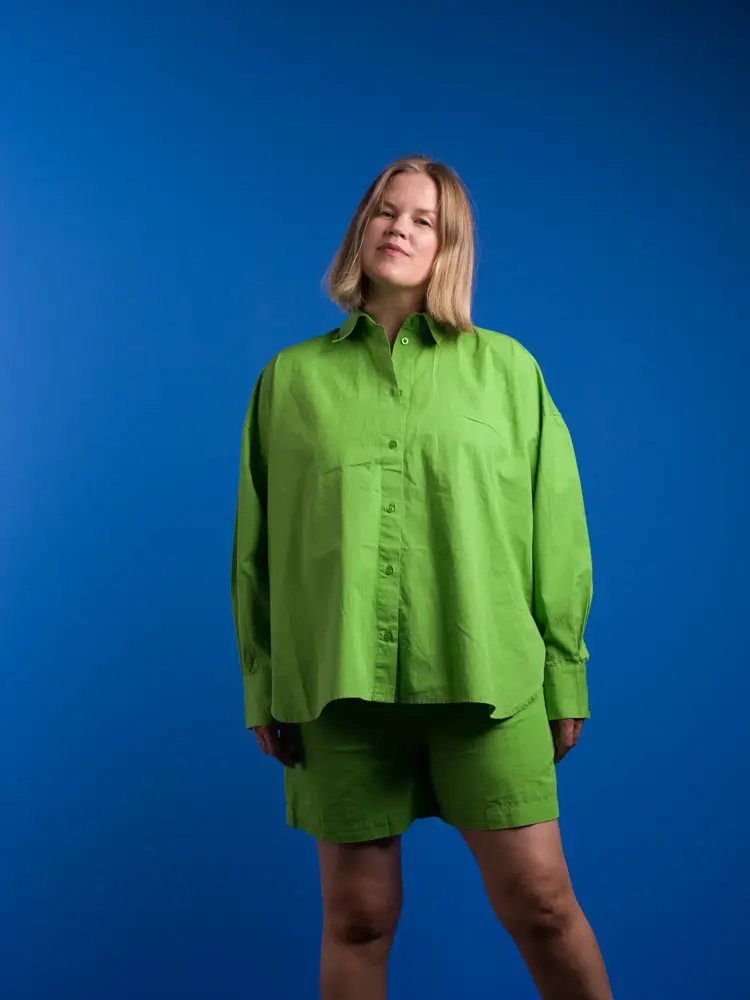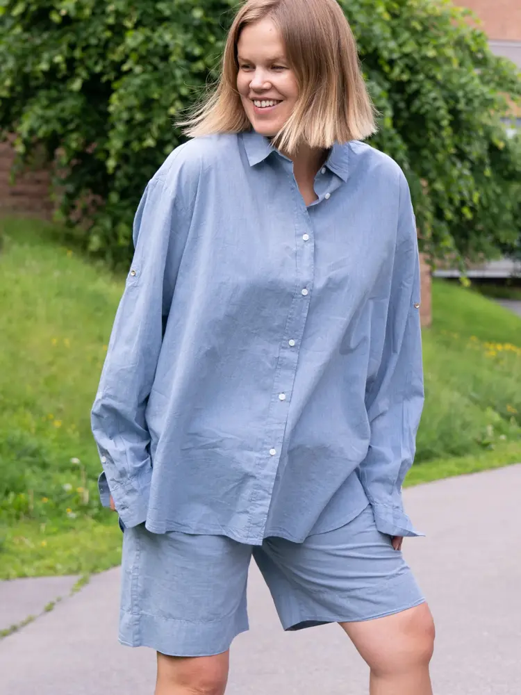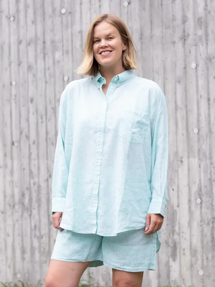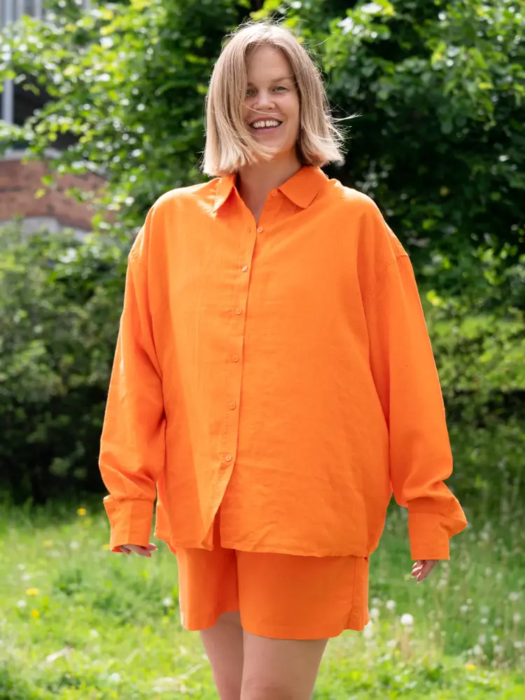 Vi har lagt vår elsk på matchende sett i sommer, og argumenterer for at det er det perfekte sommerantrekket her: Et sett med skjorte og shorts er luftig og komfortabelt. Lin og bomull er pustende og gode materialer om sommeren. Det styles enkelt og nonsjalant med alt fra flip-flopper til hæler og røde lepper, og er perfekt med badedrakt eller bikini under og passer alle kroppsfasonger.