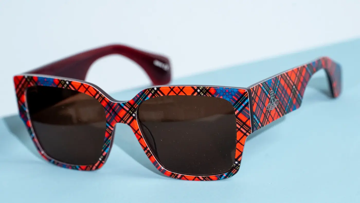 Solbriller med ruter fra Vivienne Westwood hos Specsavers, med styrke kr 4495, progressive, kr 8495. Pris inkluderer innfatning og Specsavers mest populære glass. Du betaler for en brille og får en til på kjøpet.