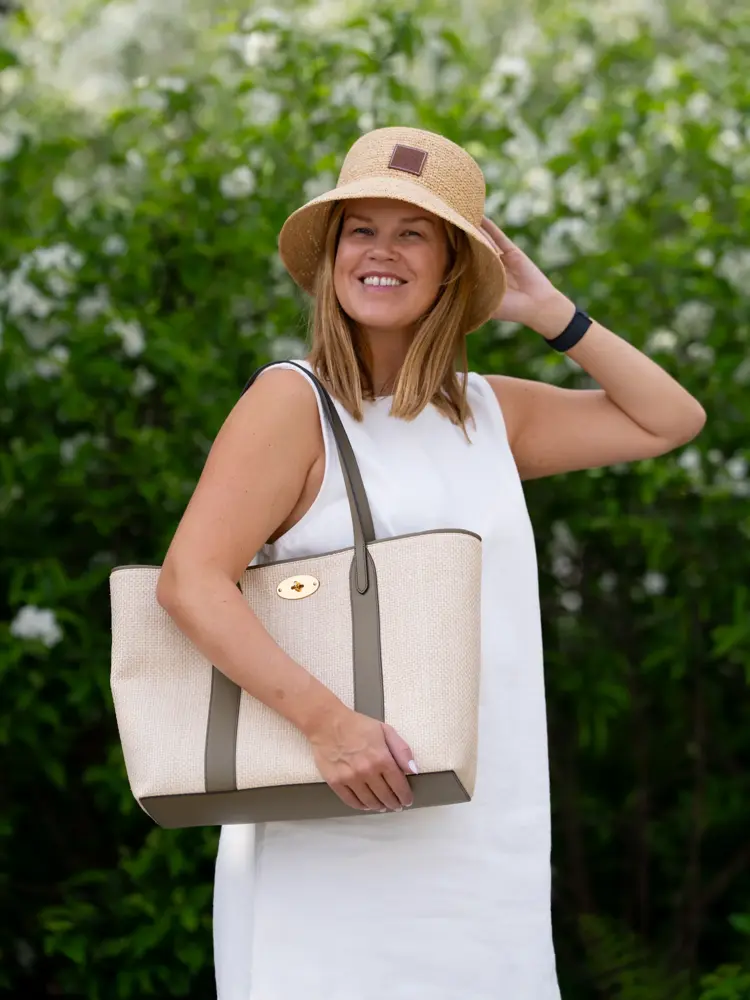 Klassisk og elegant strandveske fra 4 Woman, kr 11 150. Stråhatt fra 4 Woman, kr 2040.