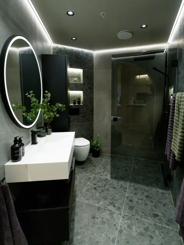 I det romslige studioet vises flere ferdige baderom i forskjellige stiler – fra moderne minimalisme til klassisk eleganse og hyttevennlige løsninger. Her kan du booke en gratis og uforpliktende tegnetime, hvor dyktige designere hjelper deg med mål, materialvalg og helhetsløsninger – presentert som fotorealistiske 3D-visualiseringer.