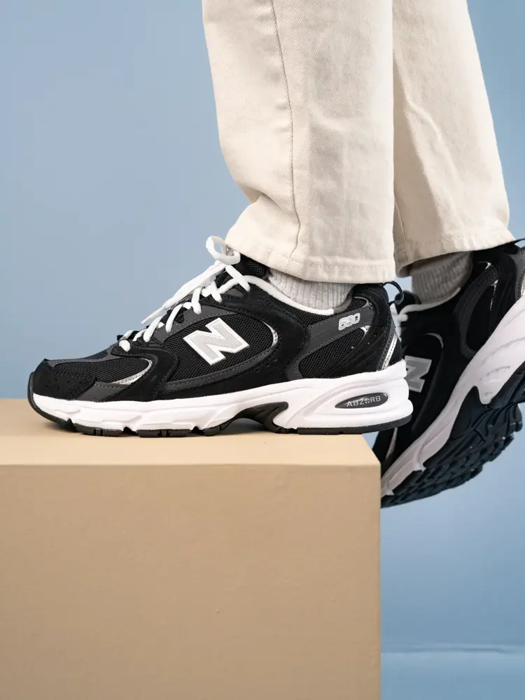 En kåpe med svart genser og skjørt blir med ett sporty med et par New Balance-sneakers på beina. New Balance er komfortable og gode sneakers i en rekke design. Det 90-tallsinspirerte designet er kult til høye tennissokker og sykkeltights, men også fine til dressbukser og blazer. Sneakers kan i grunn styles til alt.