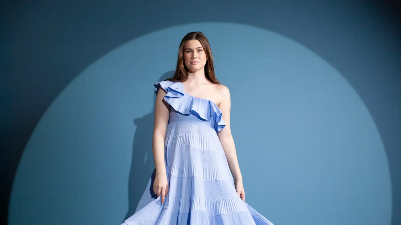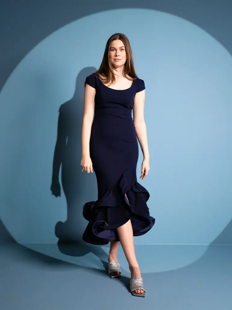 Tettsittende og mørkeblått gir vavavoom-følelser i massevis! Dette antrekket er helt gull til et bryllup i byen, der det er kult å tone ned det søte og gire opp det sofistikerte. Den tettsittende fasongen, runde utringningen og de rå volangene nederst må få skinne, så sett håret i en stram hestehale, fest et par enkle stud-øredobber i øreflippene og vips er du klar!