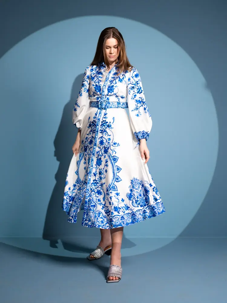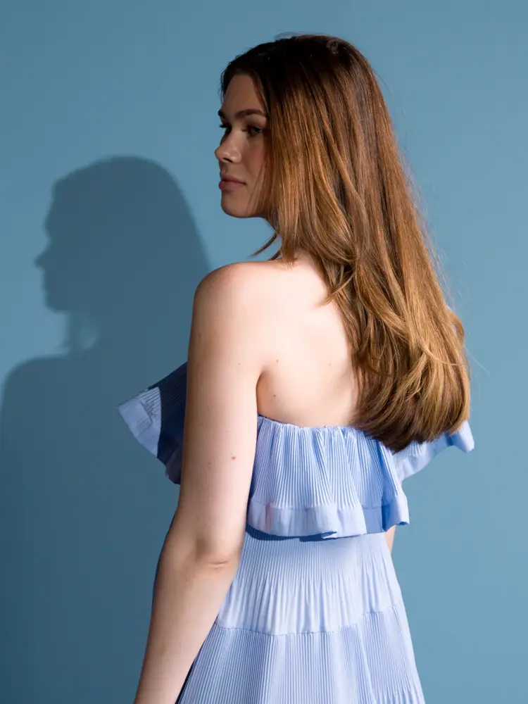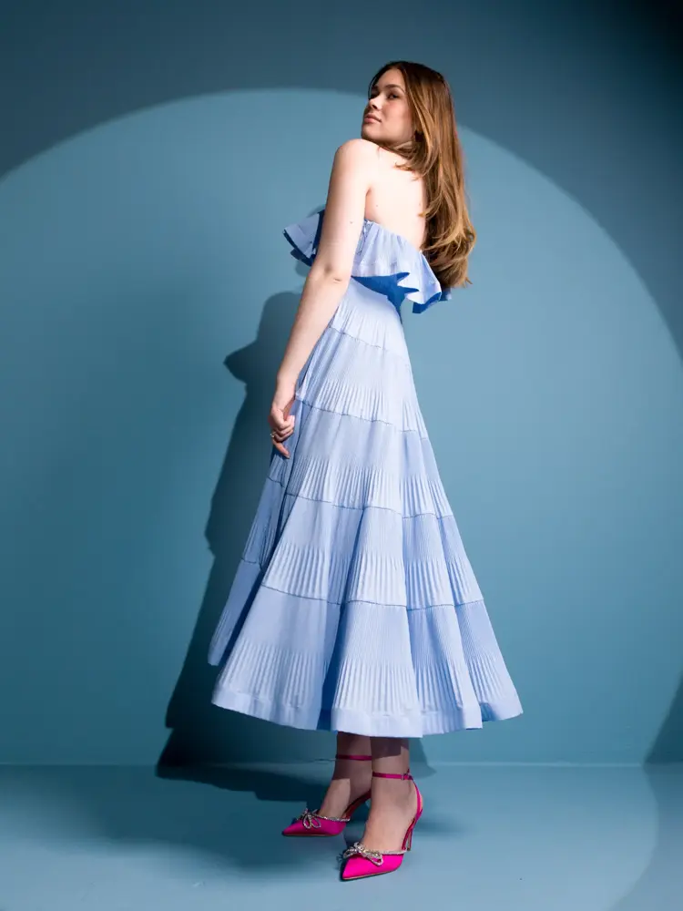 Blått og grønt i ulike sjatteringer er vakkert med gyllen hud, og helt nydelig til et sjønært bryllup. Du står i stil med omgivelsene, og disse tonene passer til så å si alle hudtoner. Vakre broderinger som kan minne om rosebroderier på bunader har lenge vært en viktig trend, og med hvit bakgrunn kommer de blå blomstene virkelig til sin rett. Style med løse bølger i håret og beige stroppesandaler. Volanger gjør sitt til at en forholdsvis enkel kjole pyntes opp, og er en flott miks av det elegante og feminine. Hva med å style den pastellblå volangkjolen med sko i en kontrastfarge, som f.eks. knallrosa?