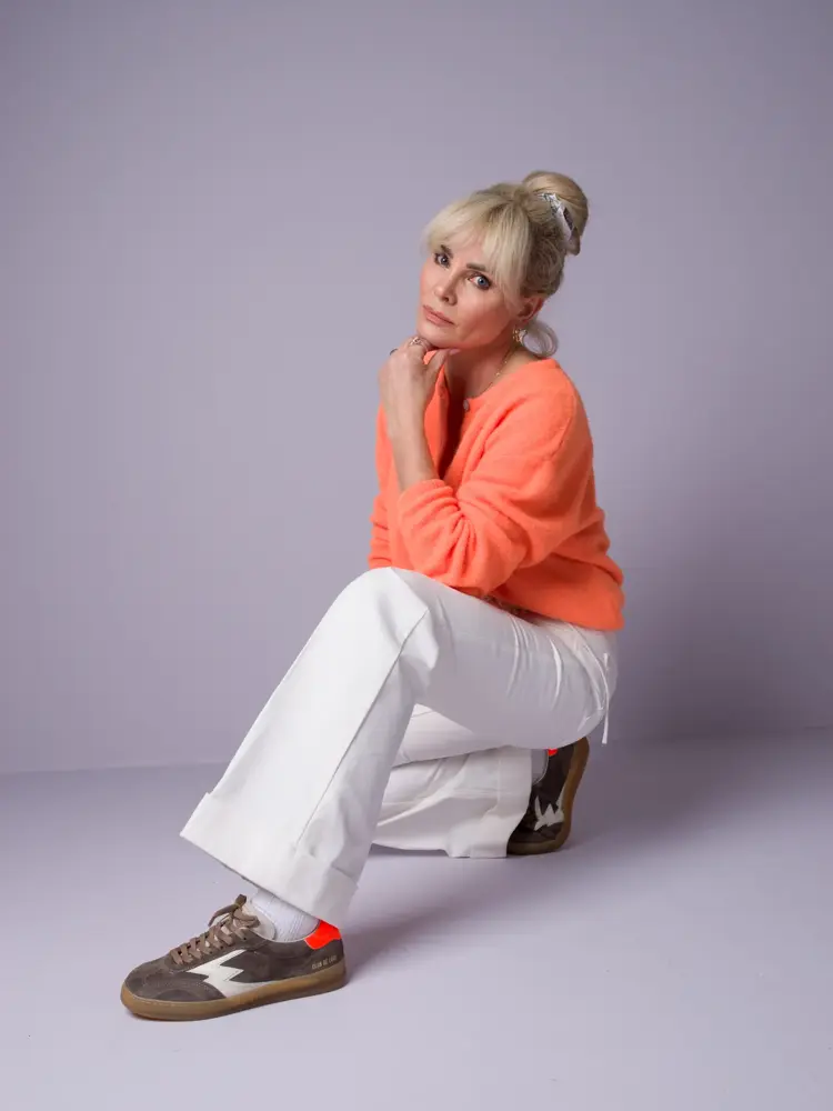 Orange genser fra Swah 2099,- Bukse fra Zara 700,- Blomst på bukse fra Sessa 199,- Sko fra Swah 3099,- Smykker fra Pandora fra 700,-