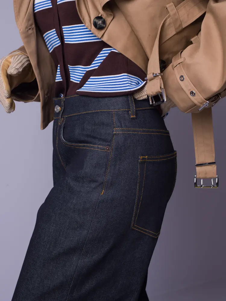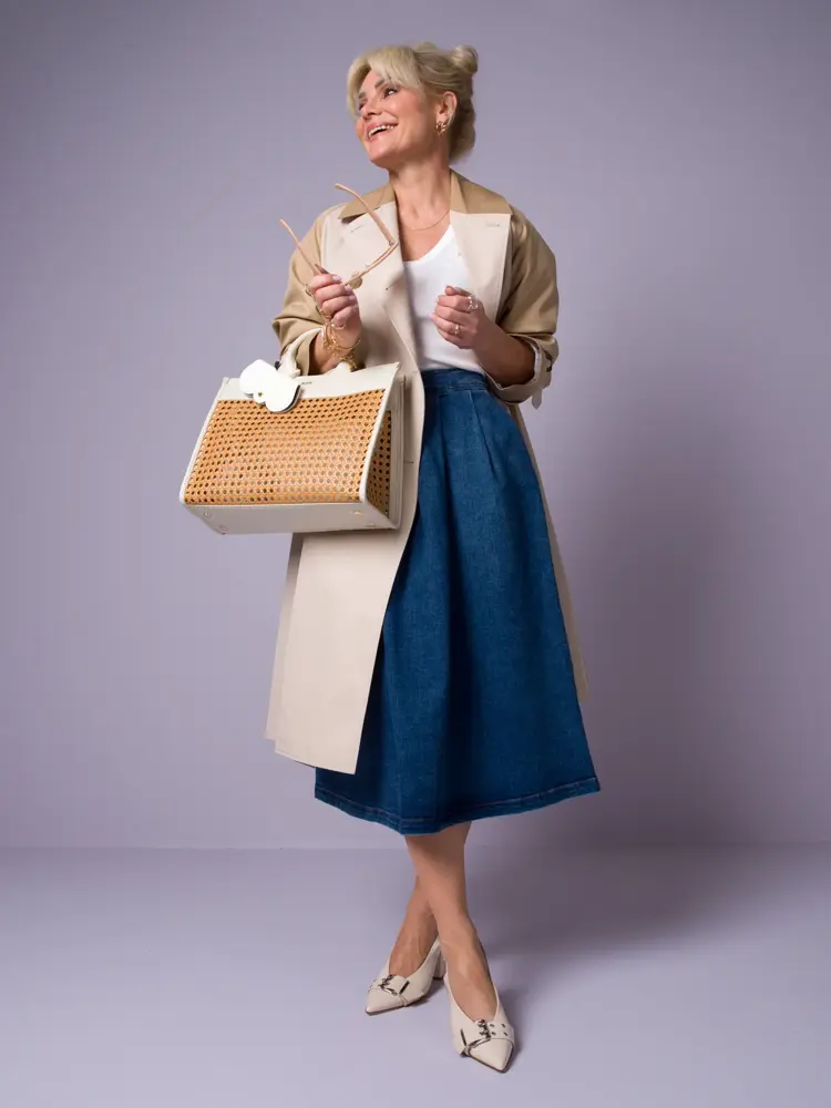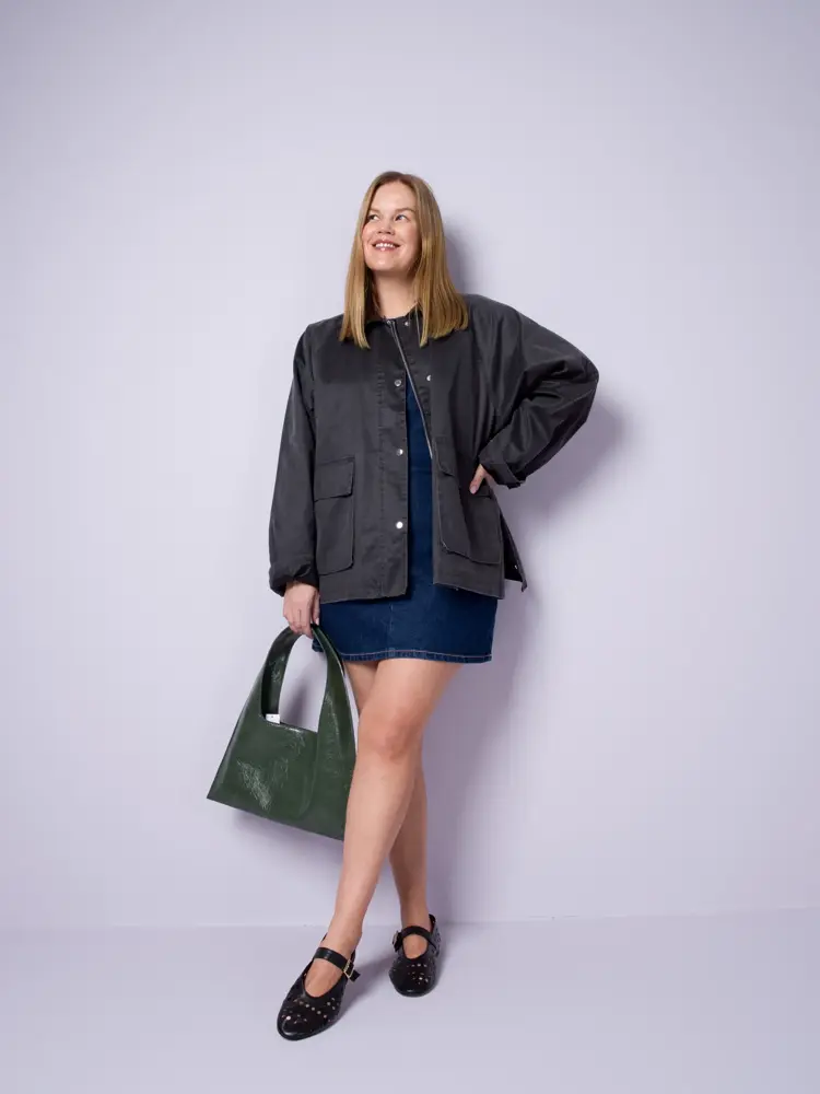 T-shirt fra The Vibe 1000,- Denimskjørt fra The Vibe 2699,- Trench fra Follestad 7799,- Veske fra Follestad 2799,- Veskepynt fra Optiker G Krogh 1300,- Sko fra Bekkestua Sko 2999,-