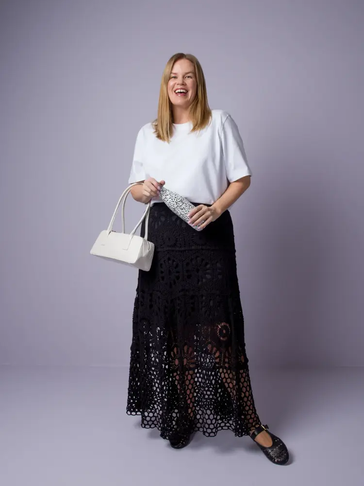 -Disse tonene er tidløse, så de går aldri av moten. En beige kjole til svart skinn gir en elegant kontrast, mens helhvitt mot grått gir en myk helhet. En gyllen brun tone mot hvitt er eksklusivt og en vinner på fest. Alltid tidløst er svart og hvitt, men tilfør gjerne detaljer for å gi litt ekstra edge til antrekket, som for eksempel skulderputer i en t-skjorte og heklet skjørt. Elsker det heklete skjørtet i vår, forteller Elen.