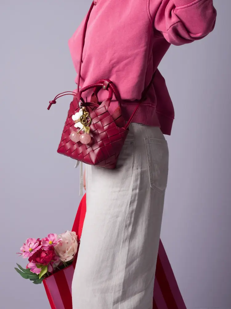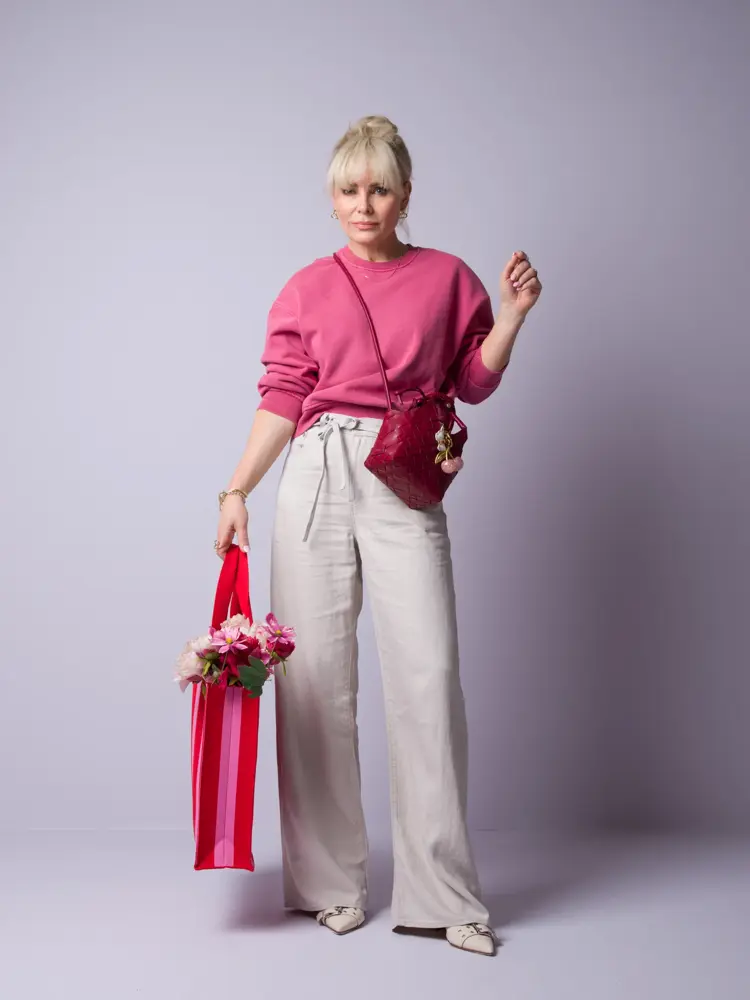 Rosa genser fra Kiman Woman 1600,- Veske fra Kiman Woman 4099,- Veskepynt fra Sessa 199,- pr stk. Denim fra The Vibe 2199,- Sko fra Nye Sko 999,- Tote fra Swah 699,-