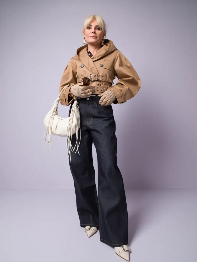Genser fra Zara 399,- Rådenimbukse fra The Vibe 2199,- Veske fra The Vibe 2500,- Ganni kort beige trench fra Mark + Brandy 5600,- Hansker fra Hanskeriet 899,- Sko fra Bekkestua Sko 2999,- Solbriller fra Loewe hos Optiker G Krogh 4450,- Smykke og øredobber fra Follestad