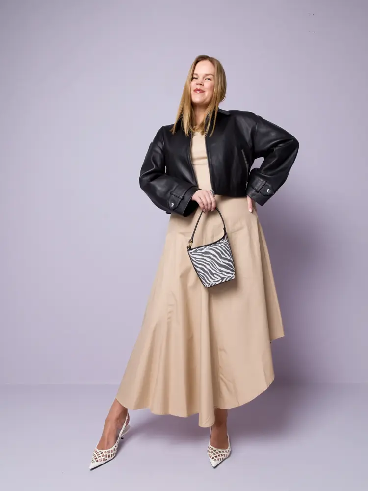 Beige kjole fra Mango 799,- Svart skinnjakke fra Illums Bolighus 5999,- Veske fra Mango 599,- Hvite sko fra Mango 699,- Øredobber fra Illums Bolighus 1400,-